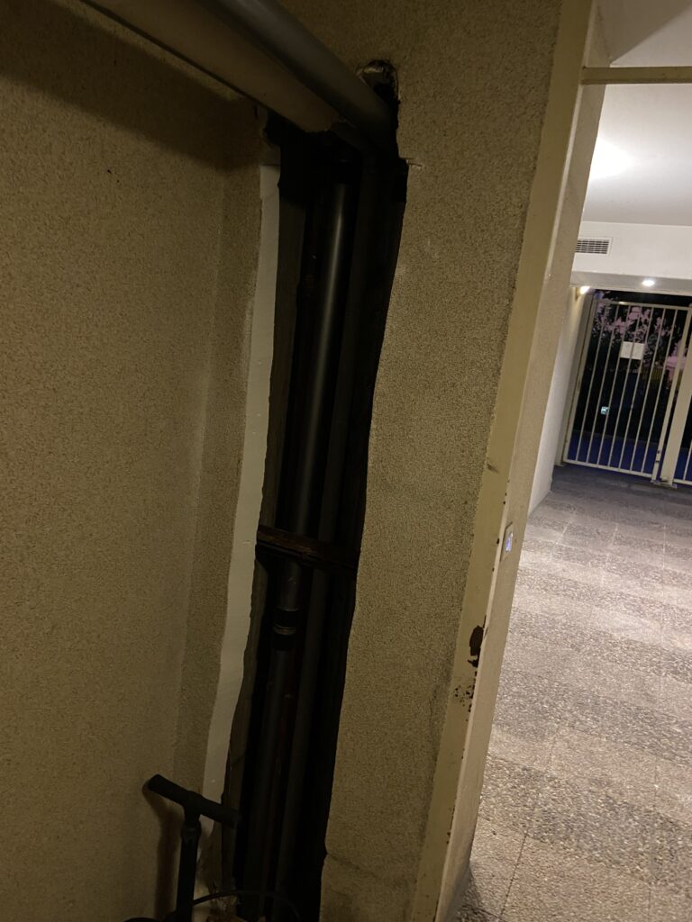 L’intervention de l’entreprise Eau Air Gaz pour accéder aux colonnes d’eau a occasionné l’ouverture du mur qui à ce jour n’a pas été rebouché.